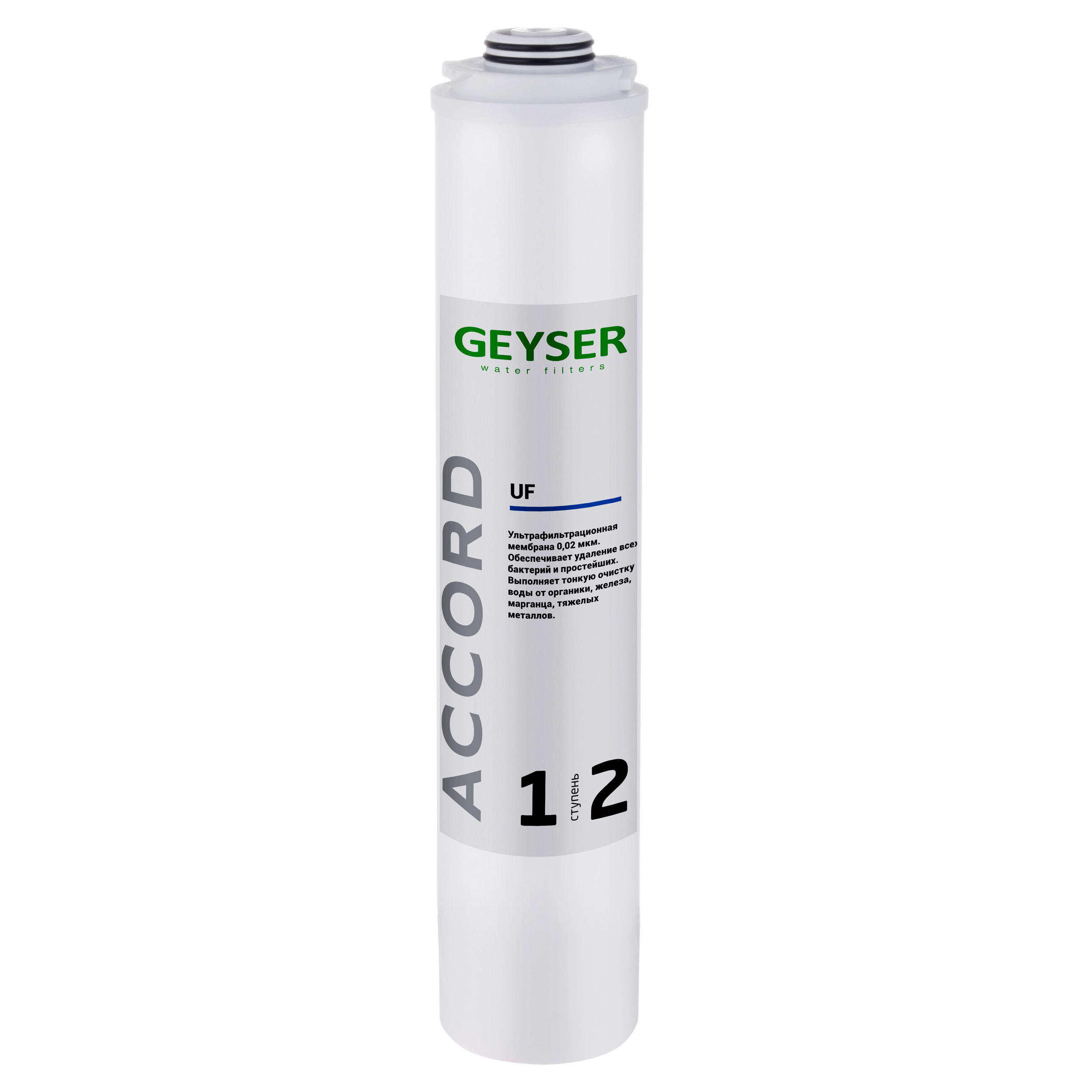 Сменный картридж c ультрафильтрационной мембраной Гейзер Аккорд выполняет глубокую очистку воды от широкого списка примесей, в т.ч. растворенного железа, марганца, хлора, микроорганизмов. В отличие от мембраны обратного осмоса, ультрафильтрационная мембрана имеет более крупные поры и задерживает примеси крупнее 0,02 мкм. Это предотвращает возможность прохождения бактерий и простейших через фильтр. Очистка воды через UF мембрану обеспечивает удаление до 97 % железа, до 99,9 % бактерий, до 100 % взвешенных частиц.