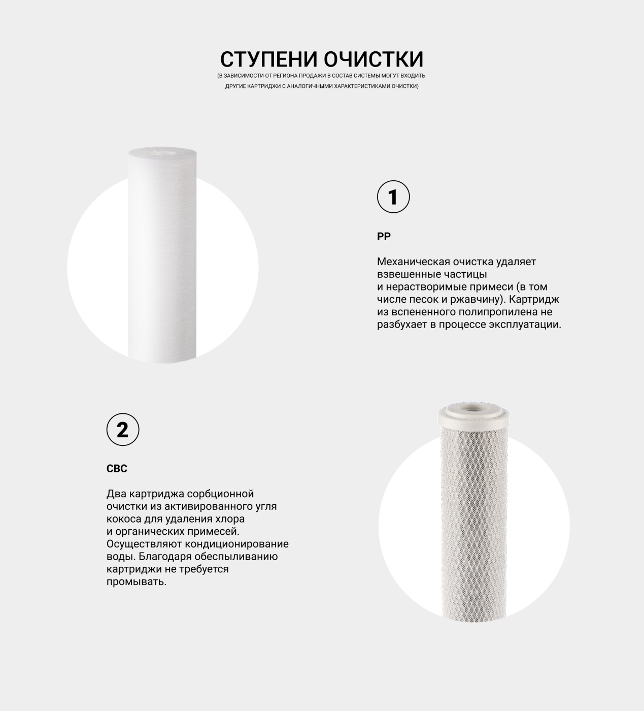 - 2 картриджа СВС — сорбционные картриджи, изготовленный из высококачественного кокосового активированного угля по технологии «Карбон блок». Эффективно удаляют органические и хлорорганические вещества, свободный хлор, неприятные запахи и посторонний привкус. Ресурс* – до 10 000 л;