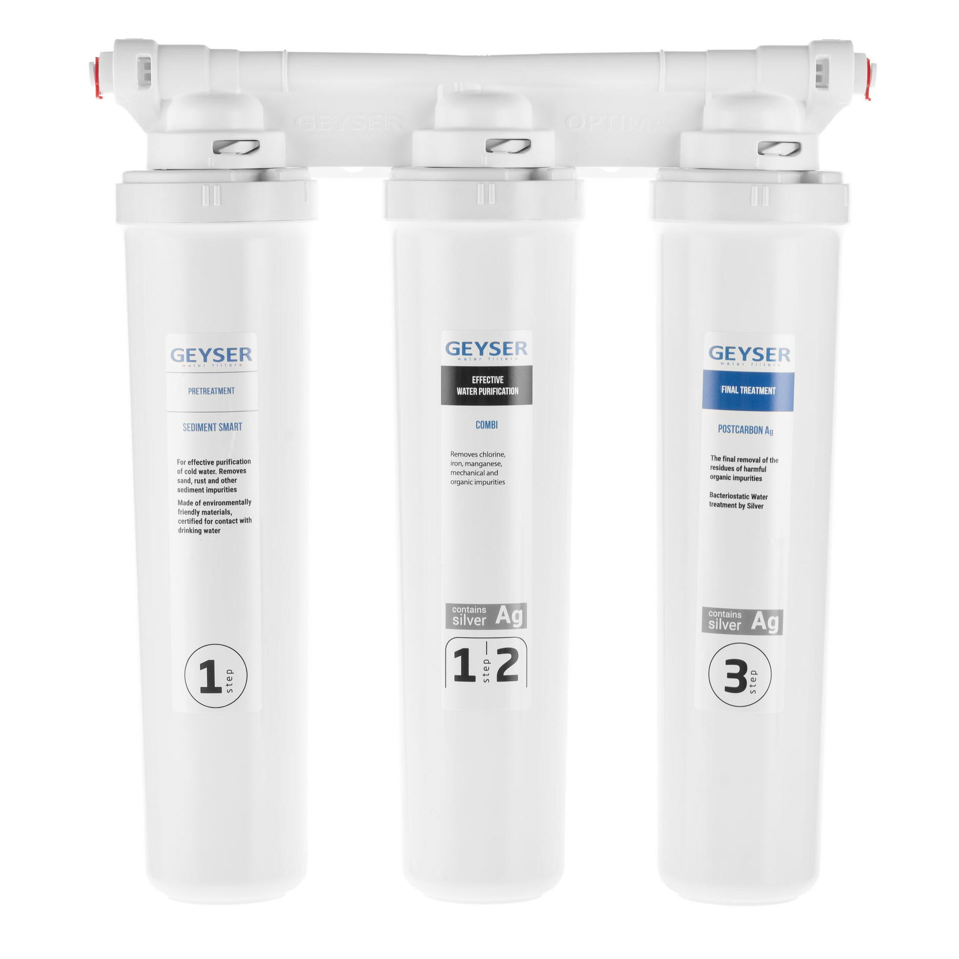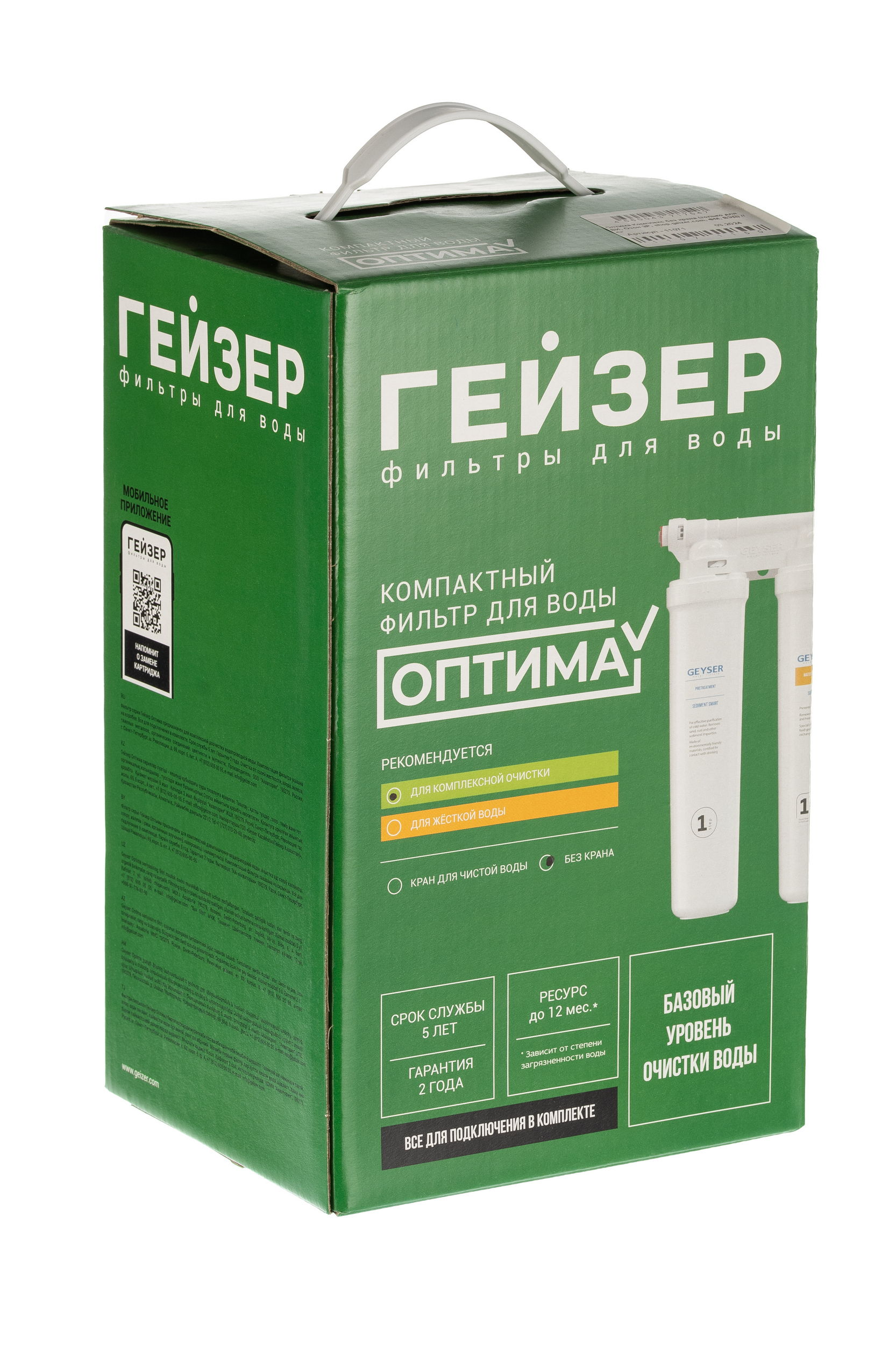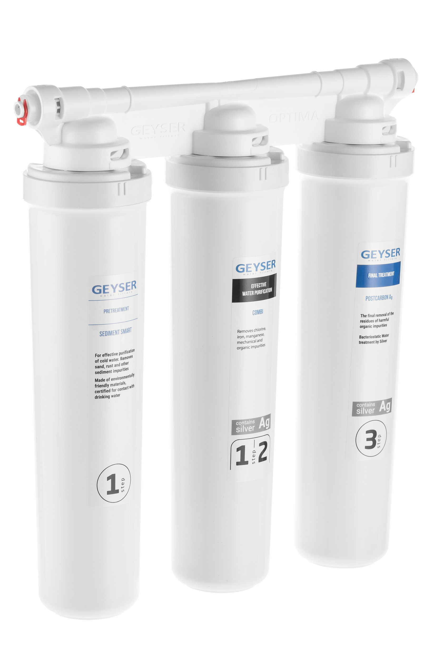 Важным свойством является самоиндикация — фильтр Гейзер Оптима для комплексной очистки сам подскажет, когда пришло время менять картриджи (уменьшение напора в кране для чистой воды).