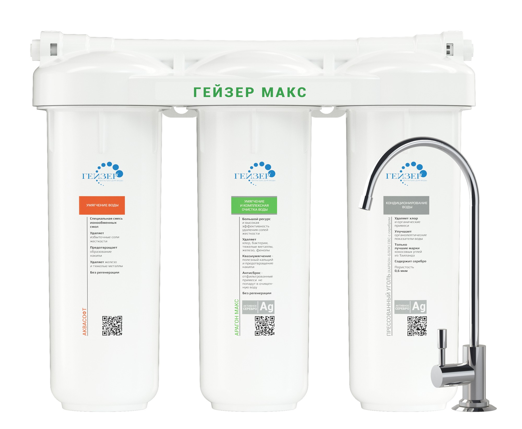 В фильтрах серии Гейзер МАКС реализованы все известные методы очистки воды: механическая фильтрация, ионный обмен, сорбция, обезжелезивание и обеззараживание.