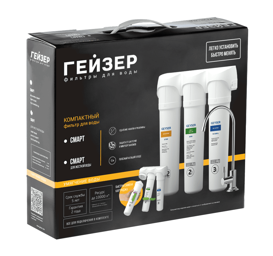 Компактная система Гейзер Смарт обеспечивает гарантированно высокую и эффективную степень очистки воды на протяжении всего срока службы. Благодаря сочетанию свойств материалов Каталон и Арагон, фильтр Гейзер Смарт удаляет все нежелательные загрязнения, умягчает воду и делает её безопасной и полезной для здоровья. Наличие быстросъемных фильтрующих модулей обеспечивает простоту и удобство обслуживания фильтра.