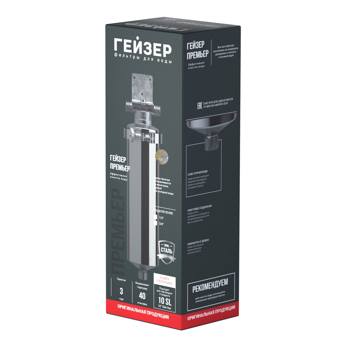 Гейзер Премьер 10SL 1/2" устанавливается на вход в систему горячего или холодного водоснабжения. Корпус фильтра изготовлен из высококачественной нержавеющей стали марки 304L, устойчивой к возникновению коррозии, что гарантирует высокую надежность и многолетнюю работу фильтра.