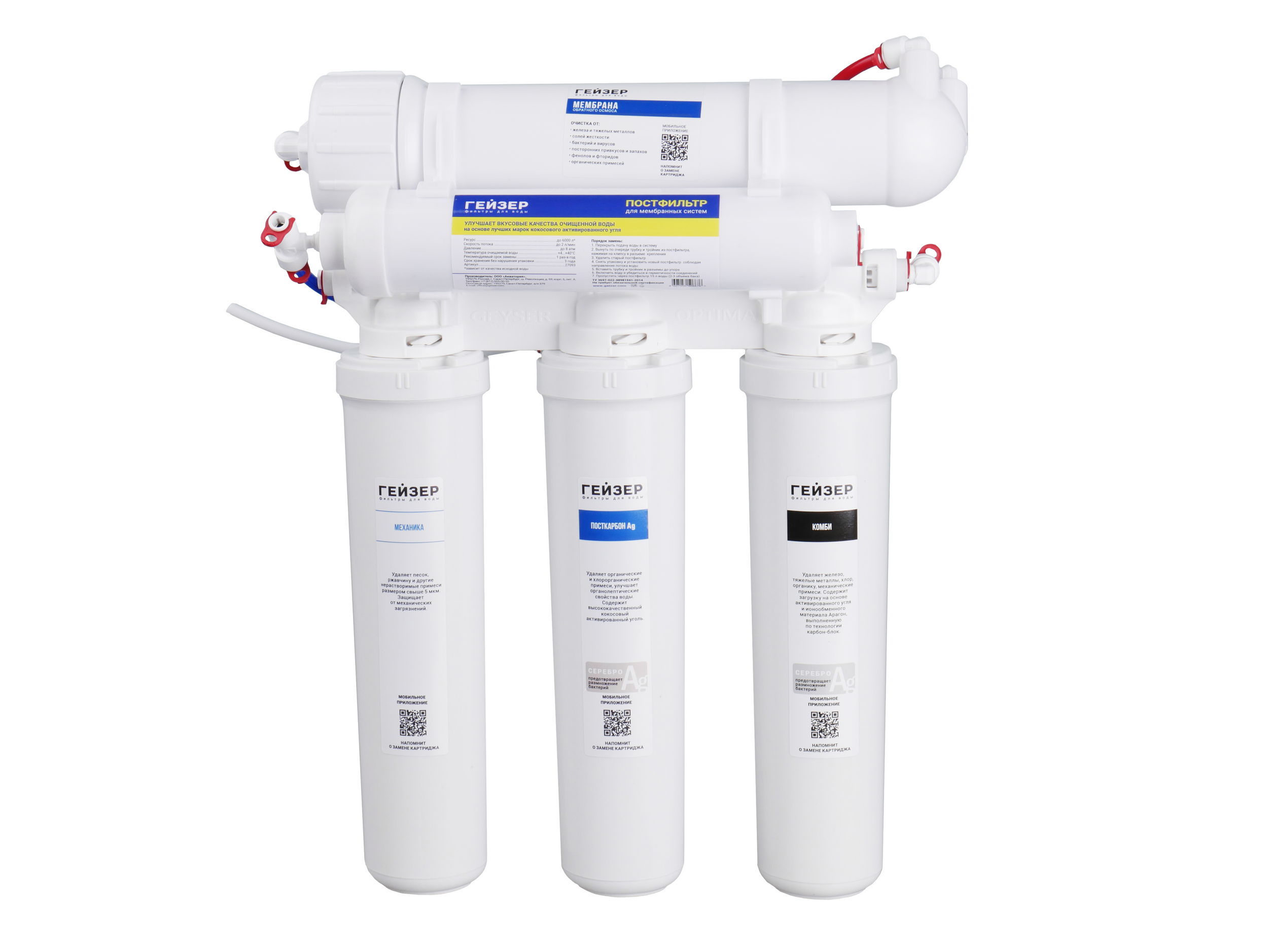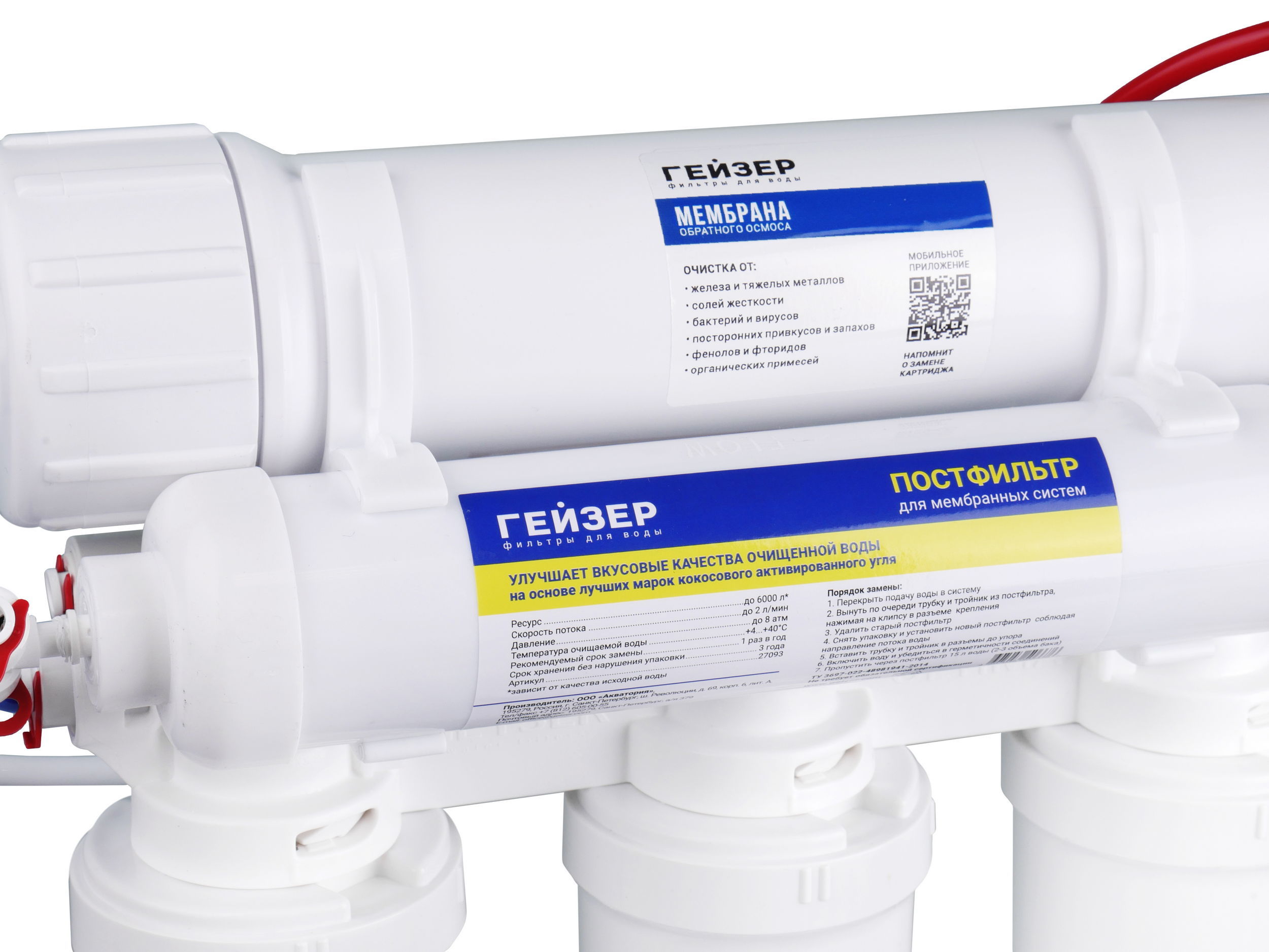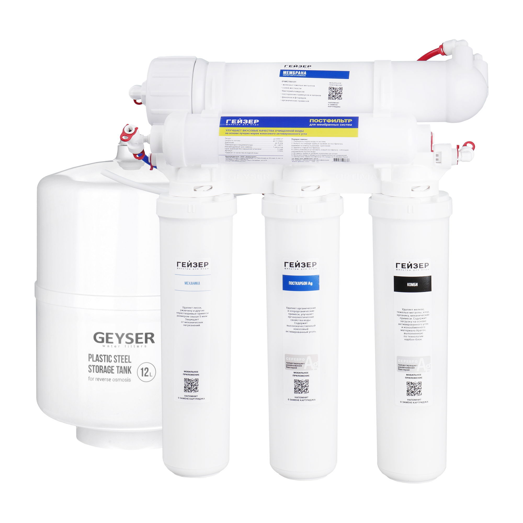 - Угольный Постфильтр – улучшает органолептику воды. Удаляет привкусы и запахи, которые могут появиться при хранении воды в накопительном баке.
