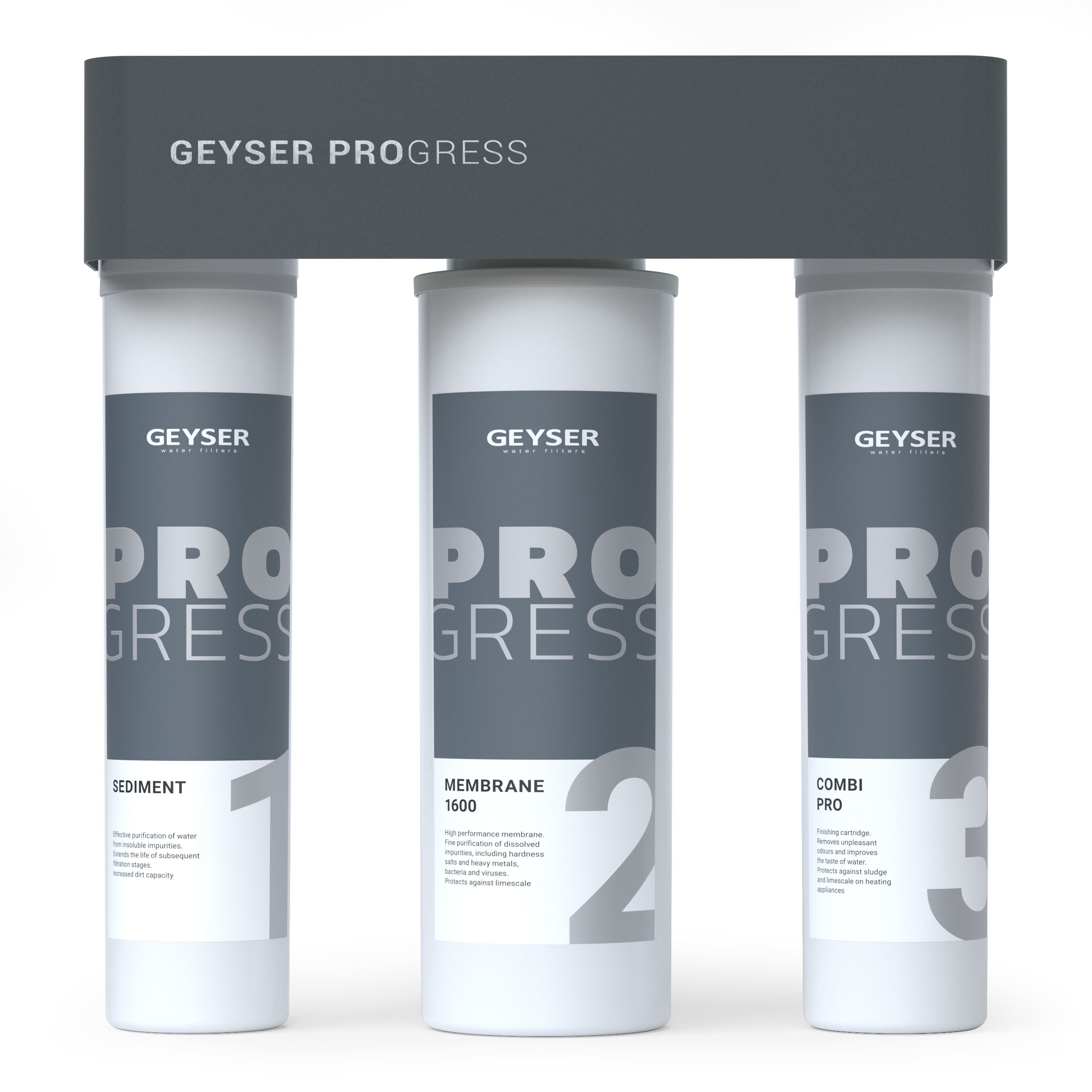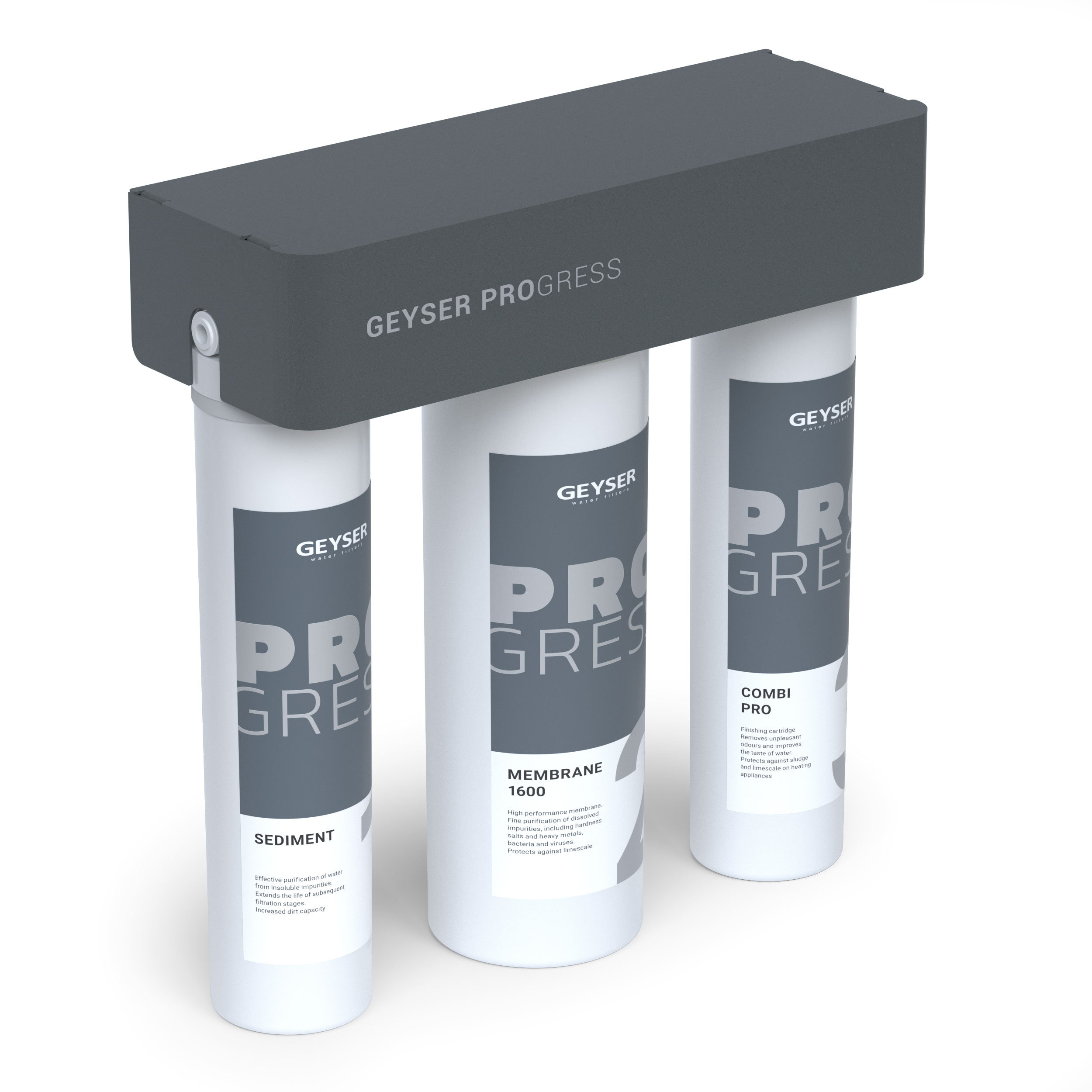 - III ступень— Комби Про Прогресс. Быстросъемный модуль финишной очистки с комбинированной загрузкой для улучшения вкусовых качеств воды после очистки мембраной. Выполняет доочистку от хлора и органических соединений, придает ей кристальную чистоту и прозрачность.