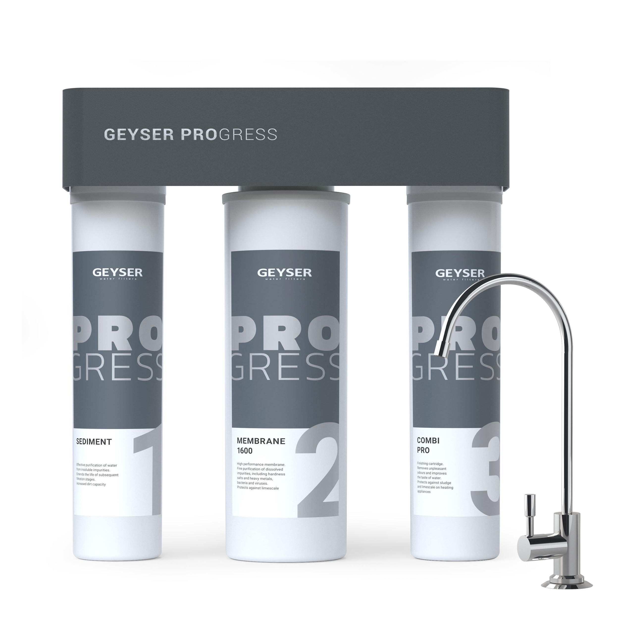 Прямоточная система обратного осмоса Гейзер ПРОГРЕСС – мембранный фильтр нового поколения. Он сочетает компактность и технологичность: высочайший уровень очистки обратноосмотической мембраны и принцип устройства трехступенчатого фильтра. Фильтр ПРОГРЕСС входит в число рекордсменов бытовых систем обратного осмоса ГЕЙЗЕР по скорости фильтрации и продуктивности. Такие показатели достигаются путем установки современной мембраны 1600 GPD.