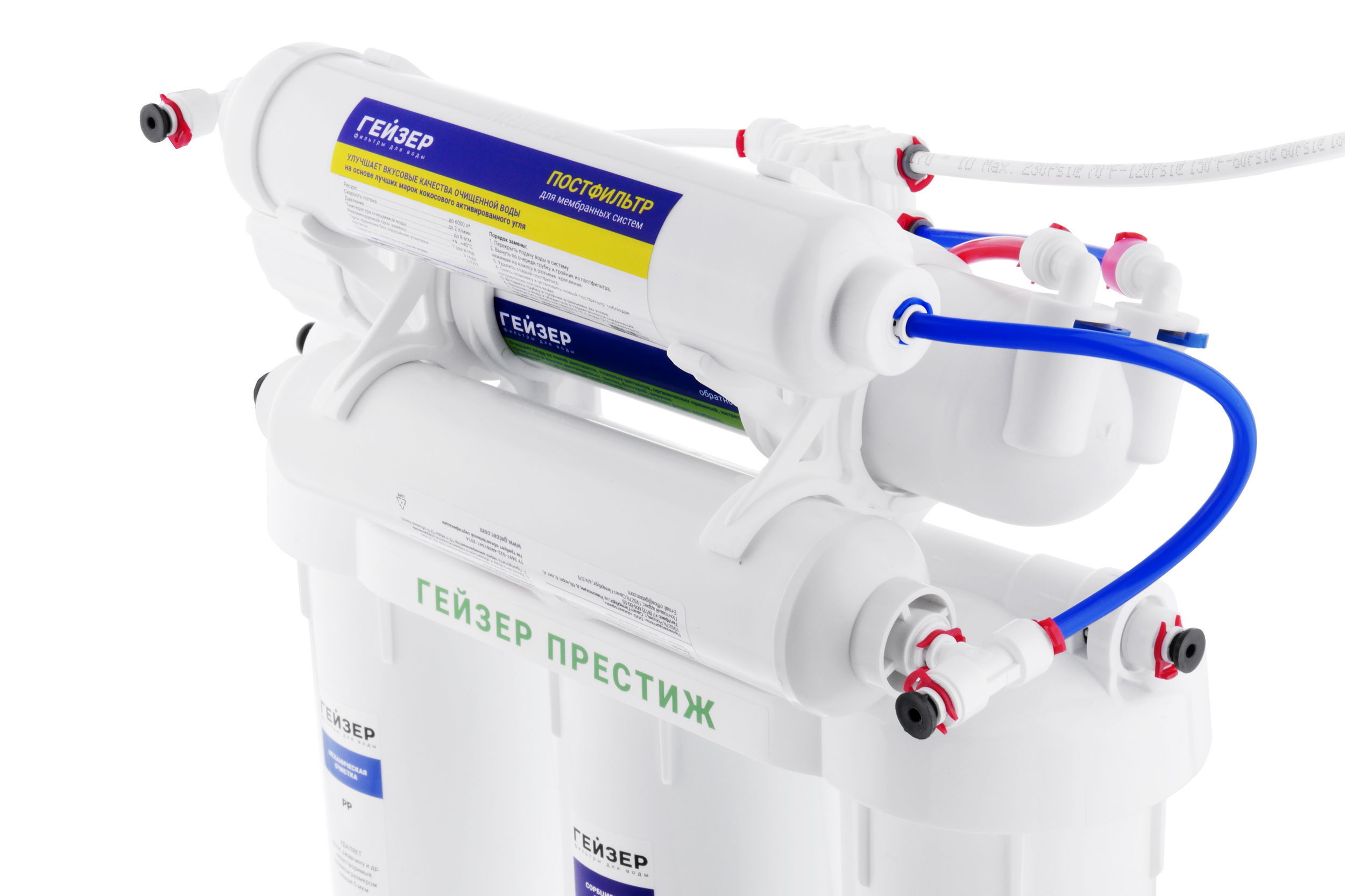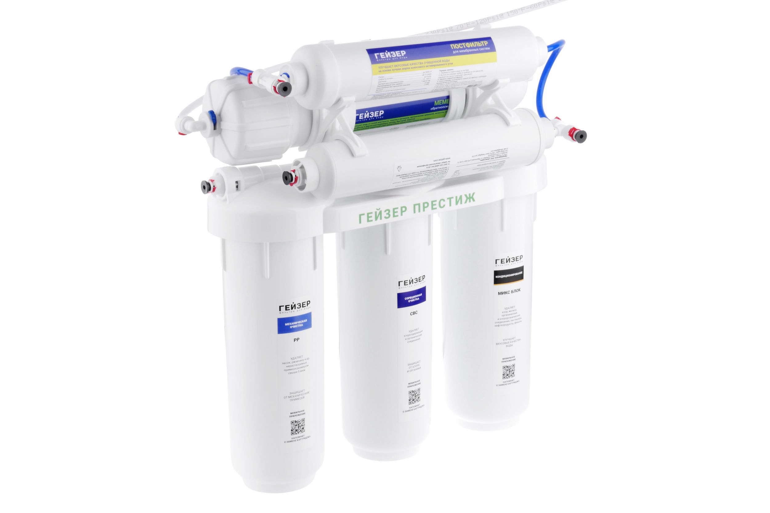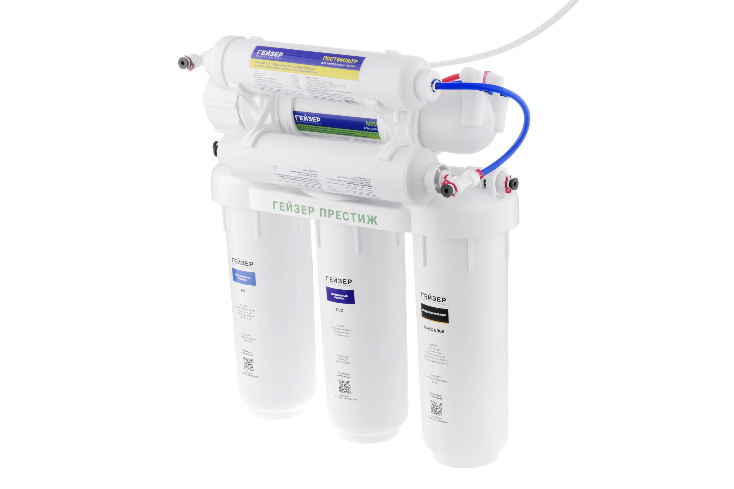 Технология обратного осмоса, использованная в фильтре Гейзер Престиж, заключается в фильтрации воды через полупроницаемую мембрану. Размеры пор мембраны настолько малы, что пропускают только молекулы воды. Размер молекул большинства примесей, а также бактерий и вирусов значительно больше молекул воды, поэтому они не проходят через мембрану. Система работает при давлении в подводящей магистрали не менее 3 атм.