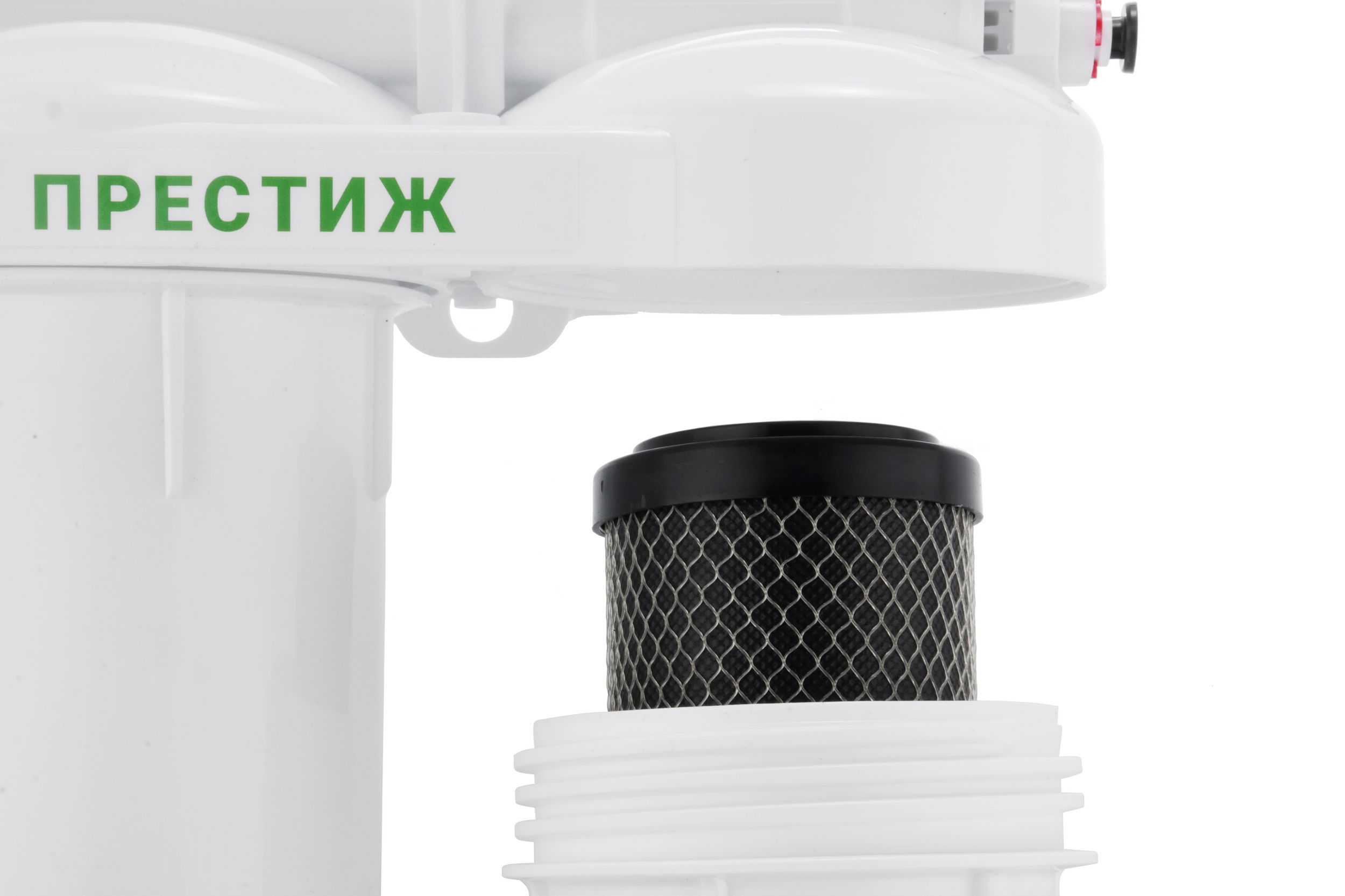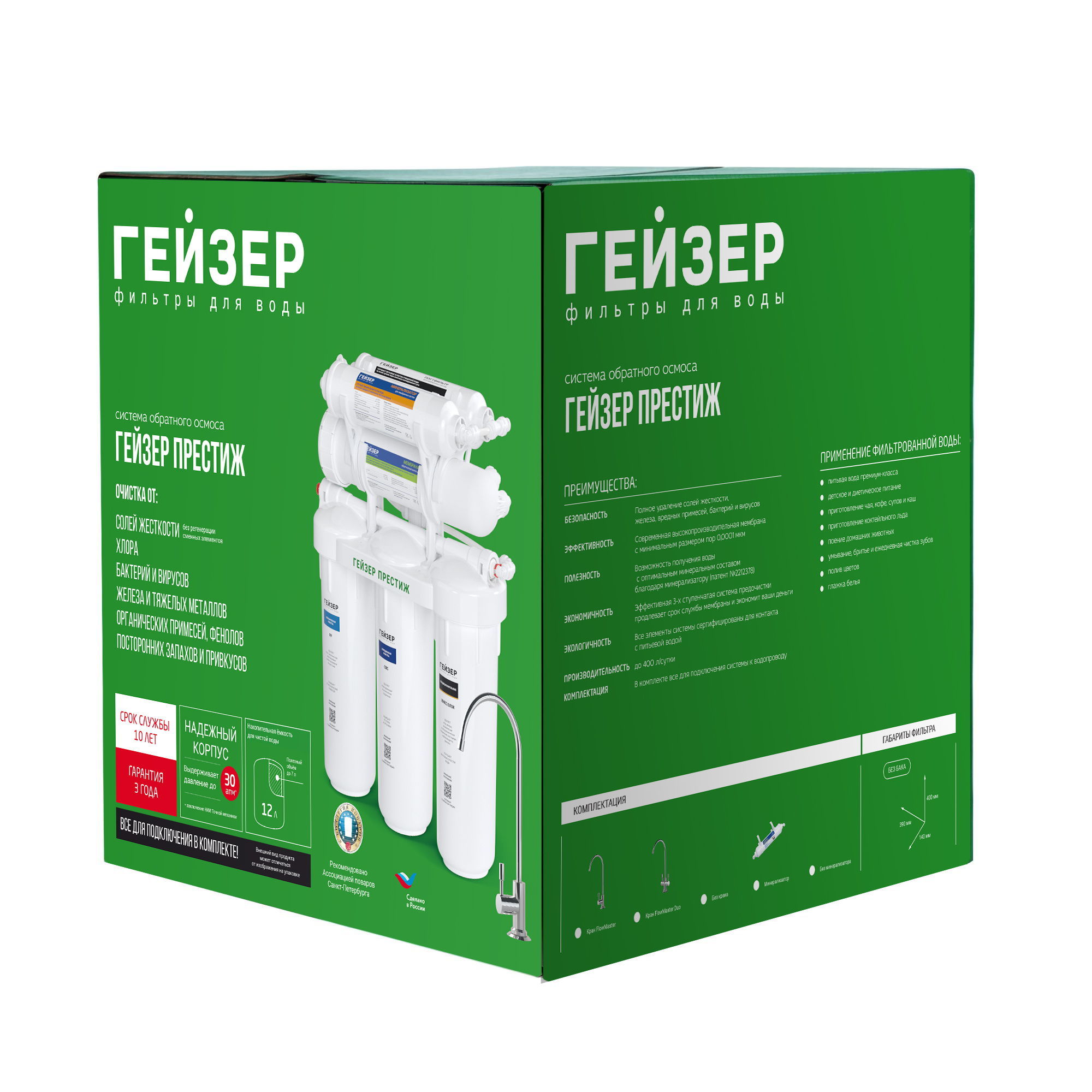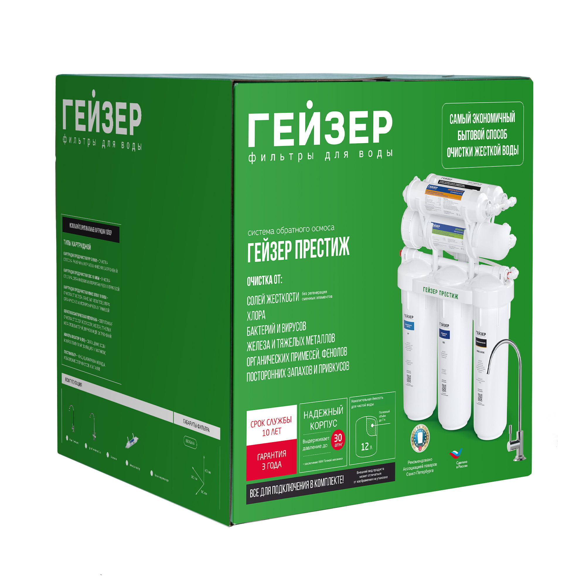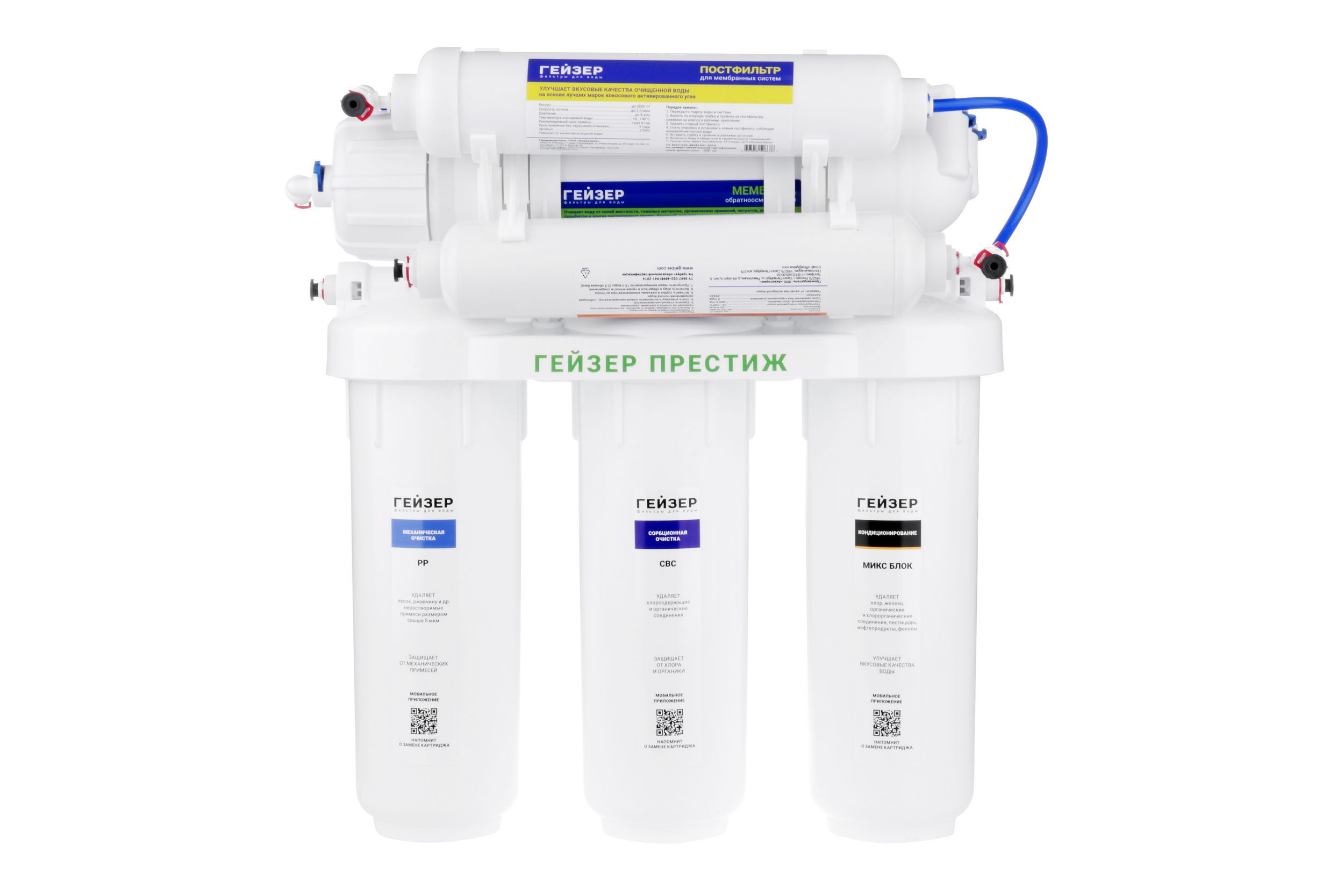 Технология обратного осмоса, использованная в фильтре Гейзер Престиж, заключается в фильтрации воды через полупроницаемую мембрану. Размеры пор мембраны настолько малы, что пропускают только молекулы воды. Размер молекул большинства примесей, а также бактерий и вирусов значительно больше молекул воды, поэтому они не проходят через мембрану. Система работает при давлении в подводящей магистрали не менее 3 атм.