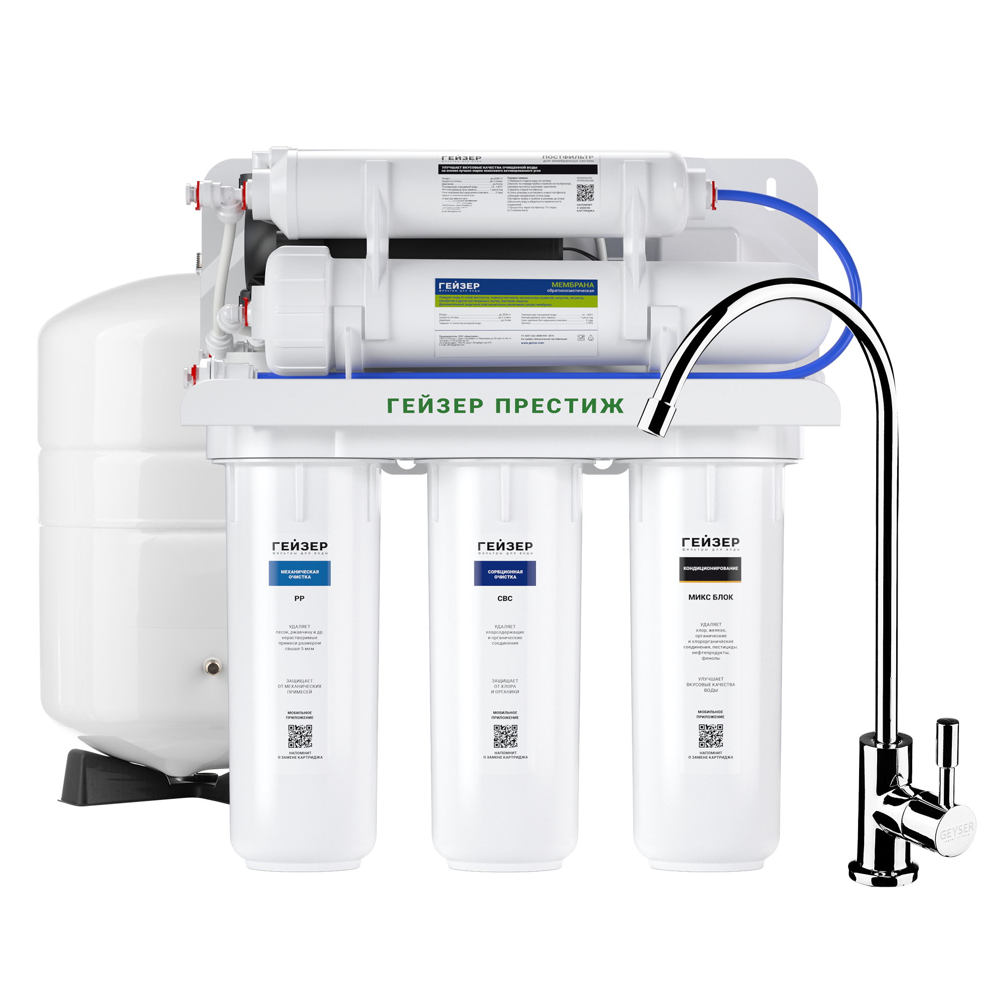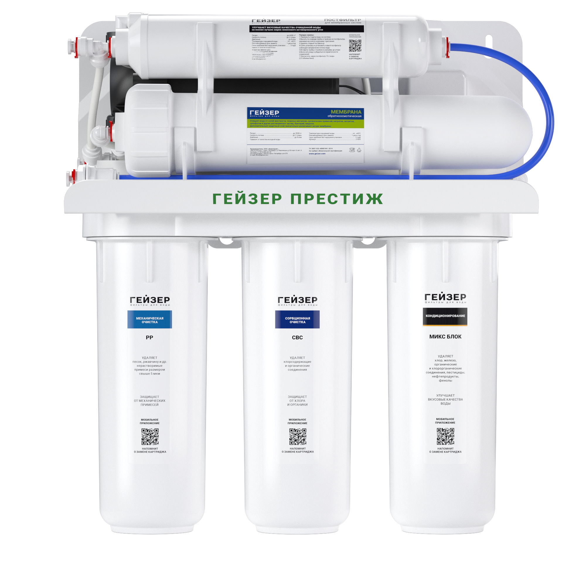 Технология обратного осмоса, использованная в фильтре Гейзер Престиж, заключается в фильтрации воды через полупроницаемую мембрану. Размеры пор мембраны настолько малы, что пропускают только молекулы воды. Размер молекул большинства примесей, а также бактерий и вирусов значительно больше молекул воды, поэтому они не проходят через мембрану. Фильтр Гейзер Престиж П работает при давлении в подводящей магистрали от 0,5 атм. Устройство повышения давления, входящее в комплект, повысит уровень давления до 3-6 атм.