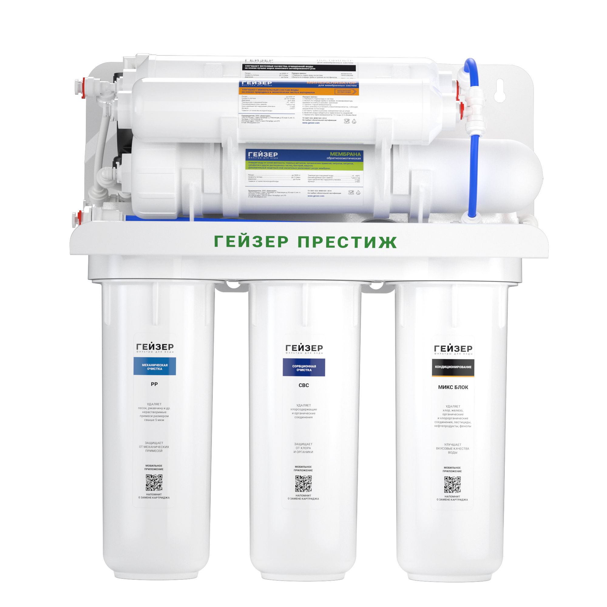 Технология обратного осмоса, использованная в фильтре Гейзер Престиж, заключается в фильтрации воды через полупроницаемую мембрану. Размеры пор мембраны настолько малы, что пропускают только молекулы воды. Размер молекул большинства примесей, а также бактерий и вирусов значительно больше молекул воды, поэтому они не проходят через мембрану. Фильтр Гейзер Престиж П работает при давлении в подводящей магистрали не менее 2 атм. Устройство повышения давления, входящее в комплект, повысит уровень давления до 3-6 атм.