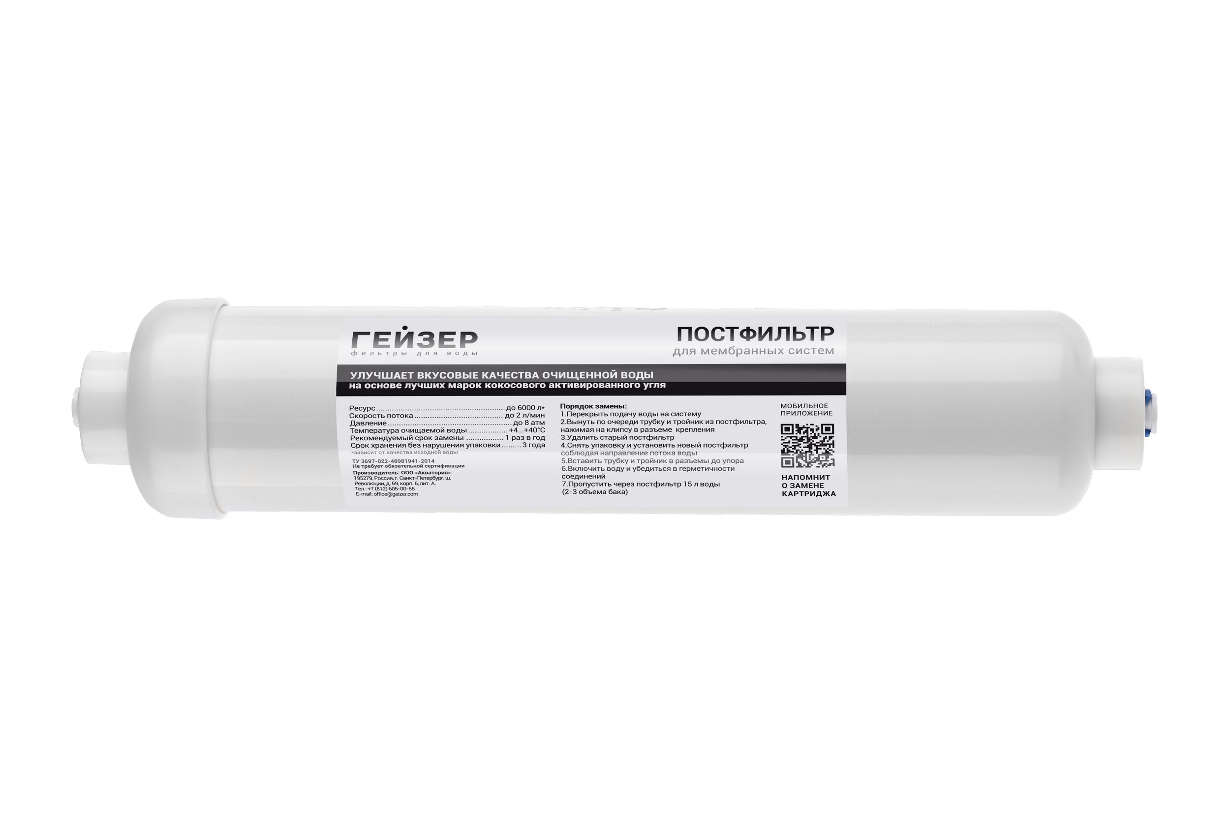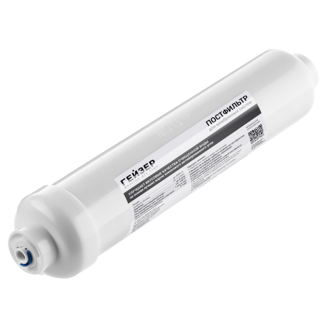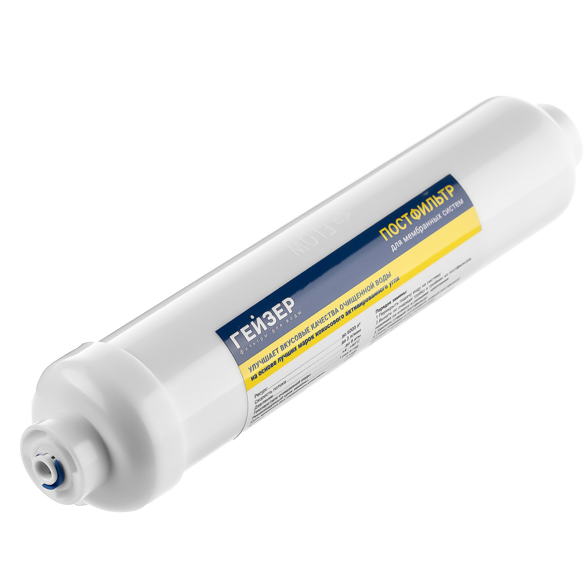Угольный постфильтр используется для доочистки и кондиционирования воды, очищенной системой обратного осмоса. Удаляет посторонние привкусы и запахи, которые могут появиться при длительном хранении воды в накопительном баке. Для моделей Гейзер Престиж с датой производства до января 2014 года рекомендуется приобретение угольного постфильтра с фитингами для подключения.