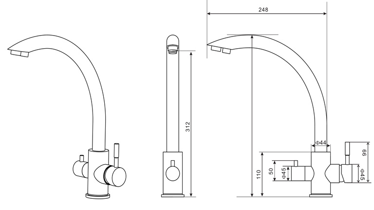 - Излив с двойной функциональностью – нет необходимости сверлить дополнительное отверстие в мойке для крана питьевой воды после фильтра;