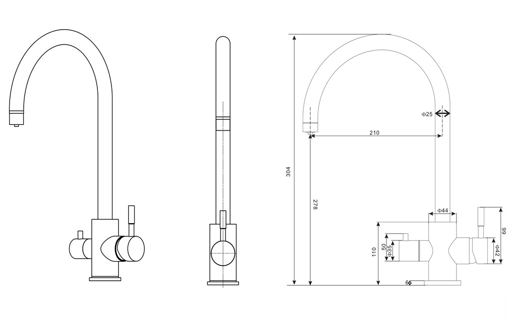 - Отдельный излив для питьевой воды и отдельный для водопроводной, вода проходит по разным каналам, не соприкасаясь друг с другом;