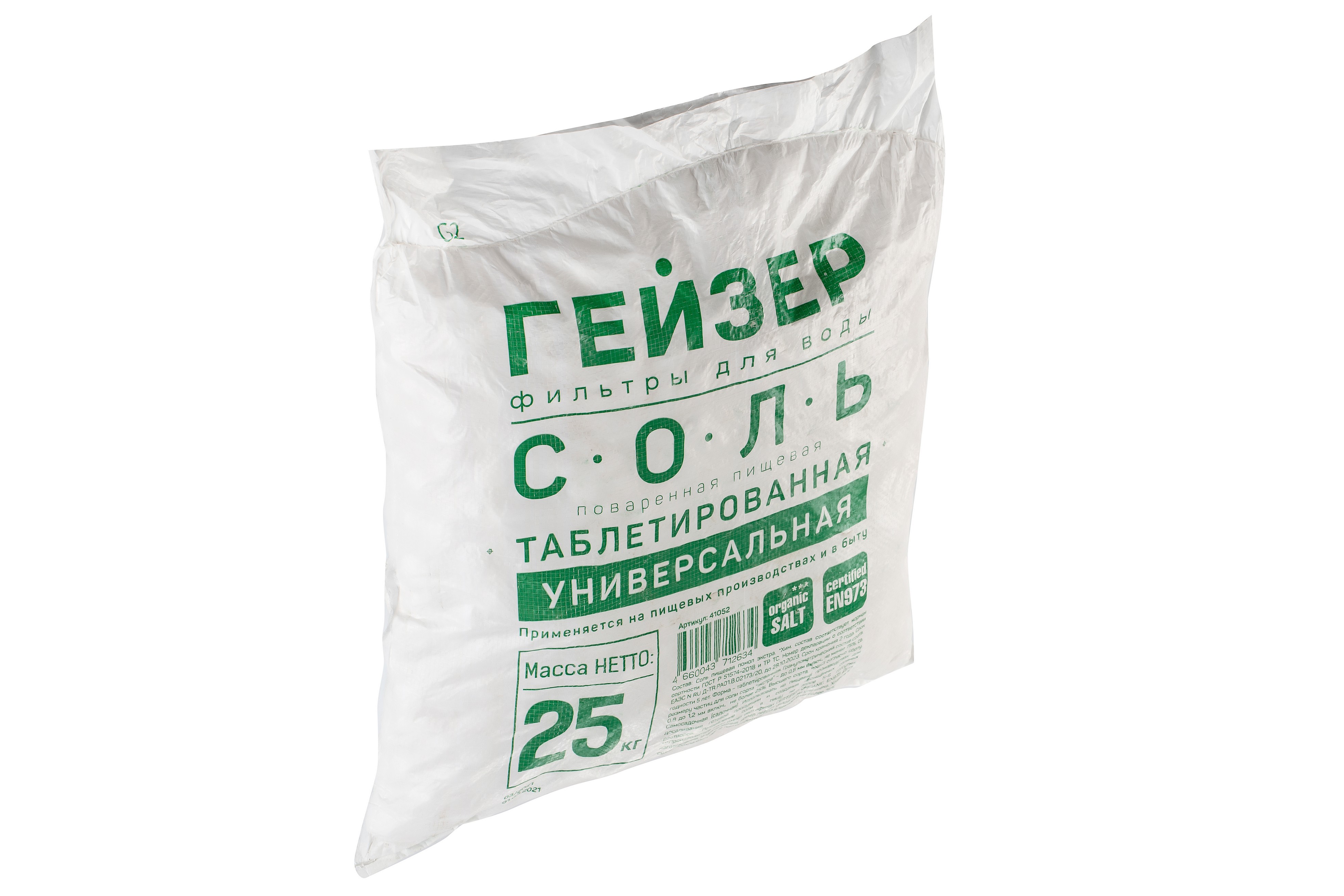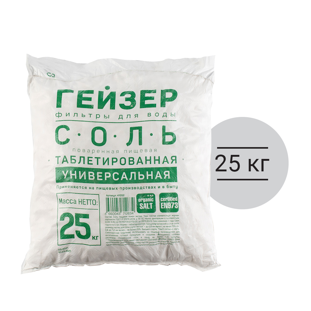 Соль таблетированная универсальная Гейзер 25 кг (арт. 41052) применяется для восстановления свойств ионообменных смол в системах умягчения воды. Используется в водоумягчительных установках, применяемых в процессах водоподготовки для пищевых, фармацевтических и прочих производств, в промышленных и коттеджных системах отопления и горячего водоснабжения.