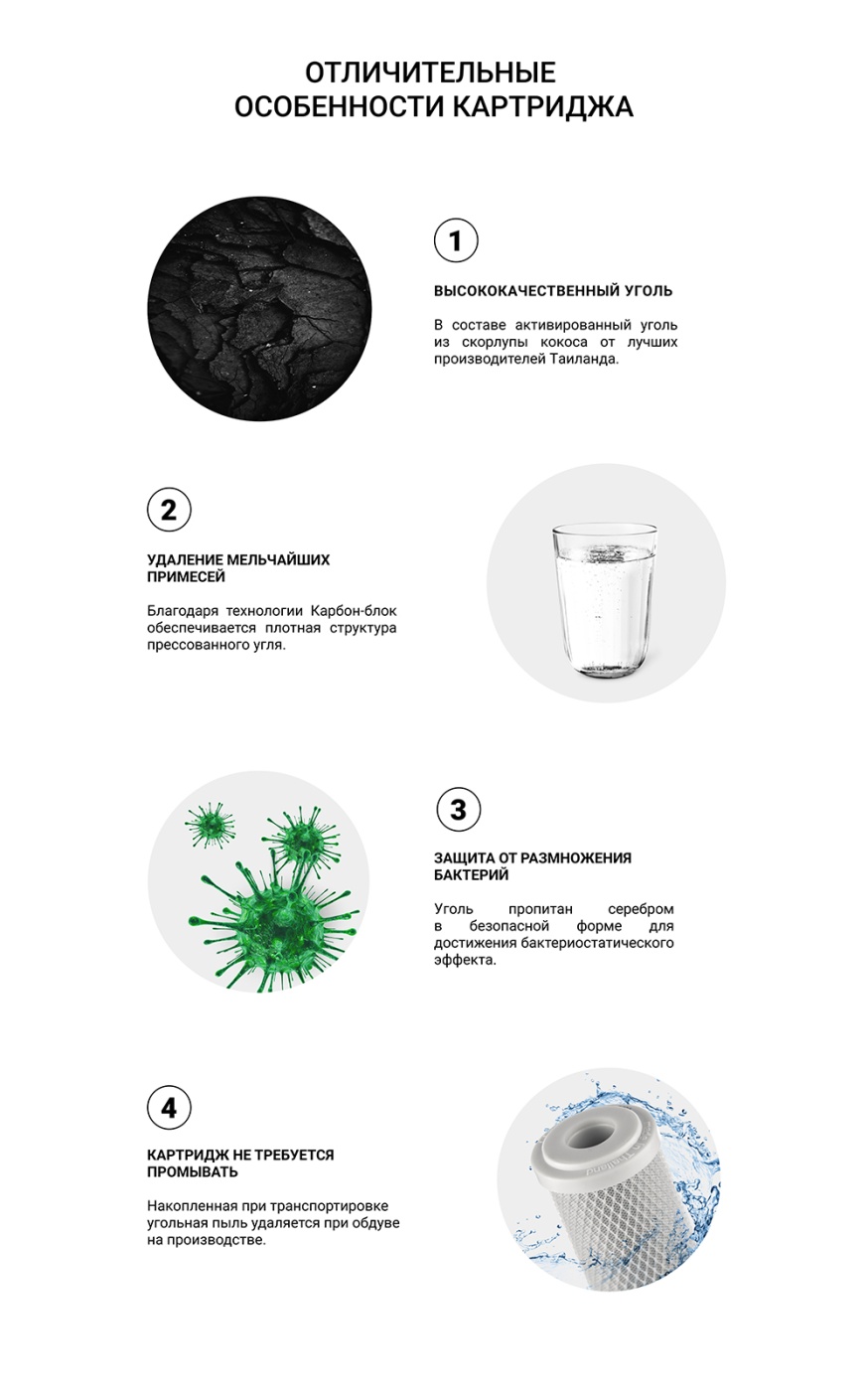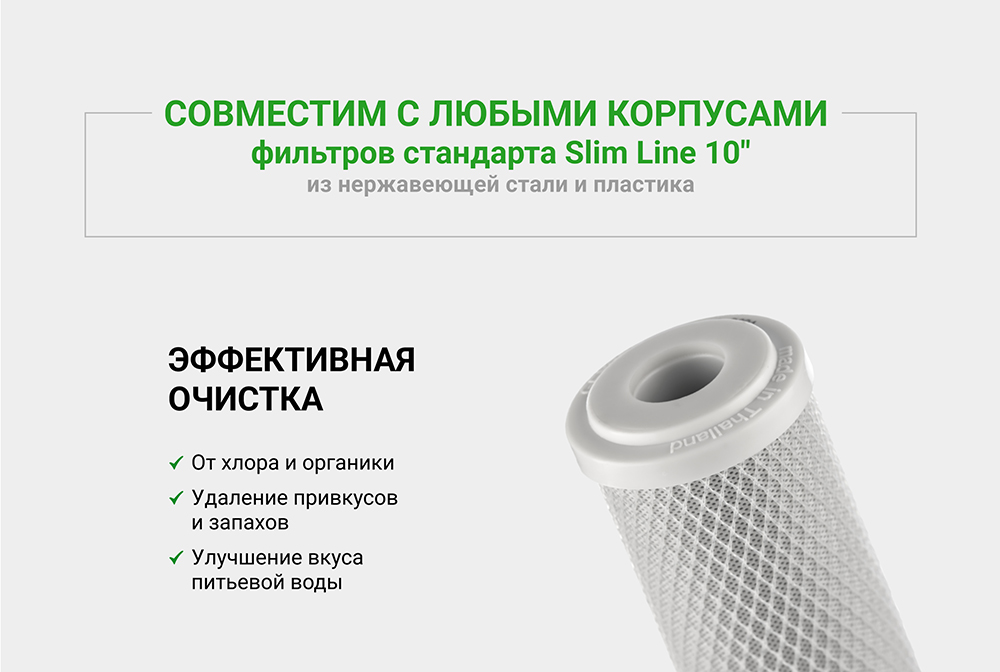 Картридж CBC 0.6 - 10SL изготовлен из высококачественного кокосового прессованного активированного угля по технологии карбон-блок, что обеспечивает глубокую очистку воды от хлора, органических и хлорорганических соединений. Устраняет неприятные запахи и улучшает вкус воды.