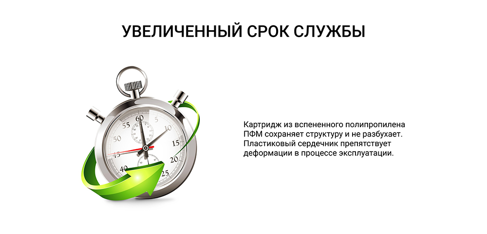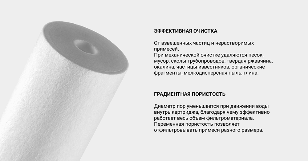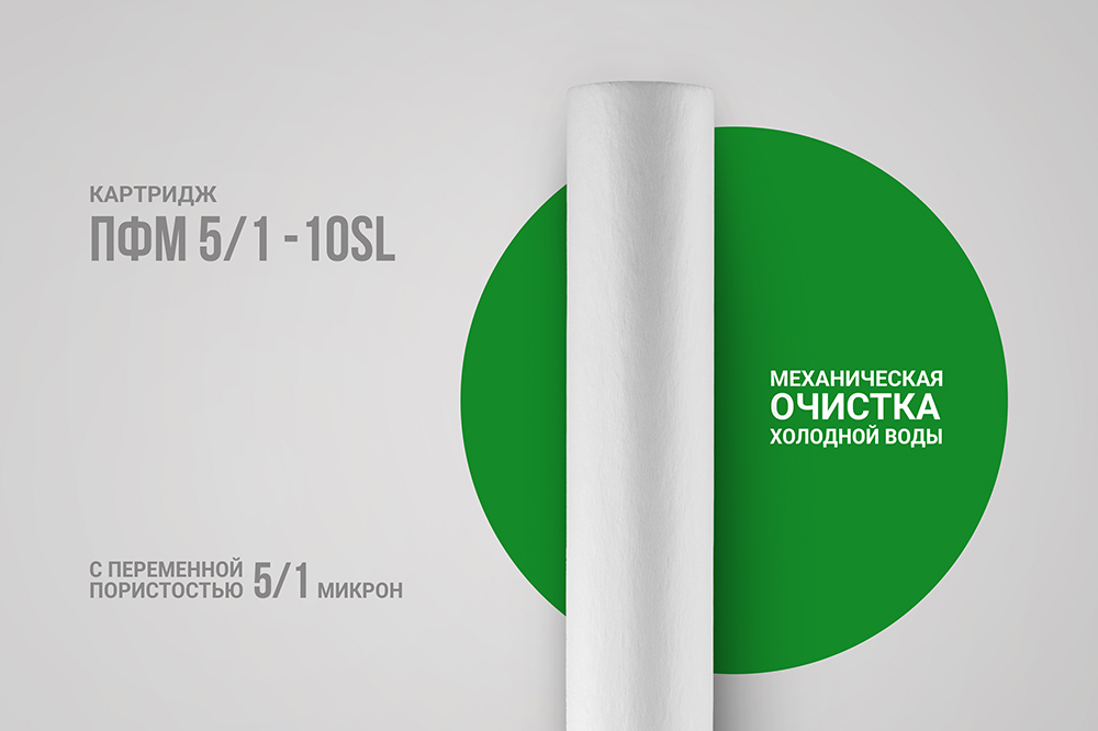 Картридж ПФМ 5/1 - 10SL изготовлен из вспененного полипропилена. Имеет градиентную пористость: диаметр поры уменьшается при движении воды внутрь картриджа, благодаря чему работает весь объем фильтрующего материала.